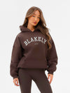 Our Varsity Hoodie in Dark Chocolate is crafted from a soft cotton blend with an oversized fit. It has ribbed hem and cuffs and features our Varsity logo in bold on the front.